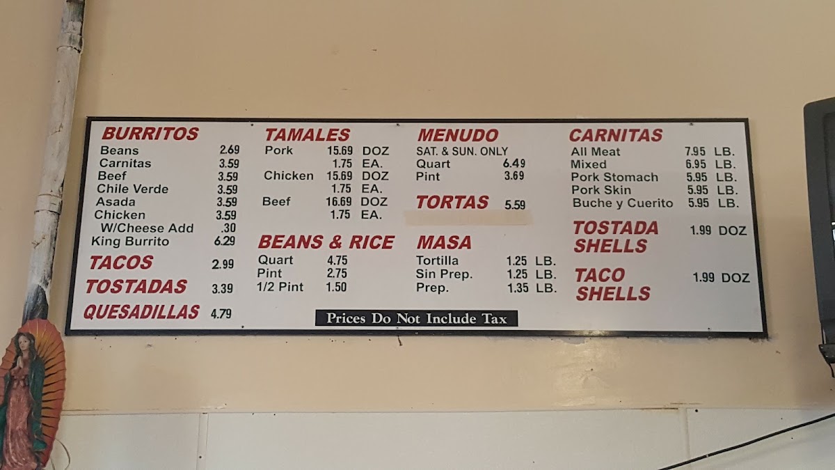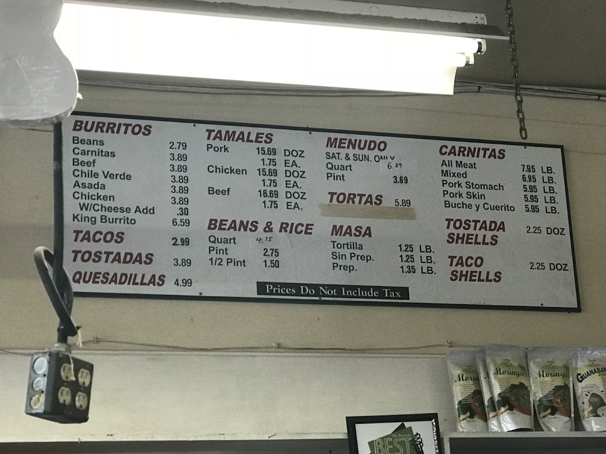 Visitors often use the menu for convenient quick orders, with the option to place orders by phone for pickup. The availability of items like tamales may require advance ordering due to limited quantities. The menu is structured around main food categories common to Mexican markets and prepared food vendors, emphasizing homemade and fresh ingredients.